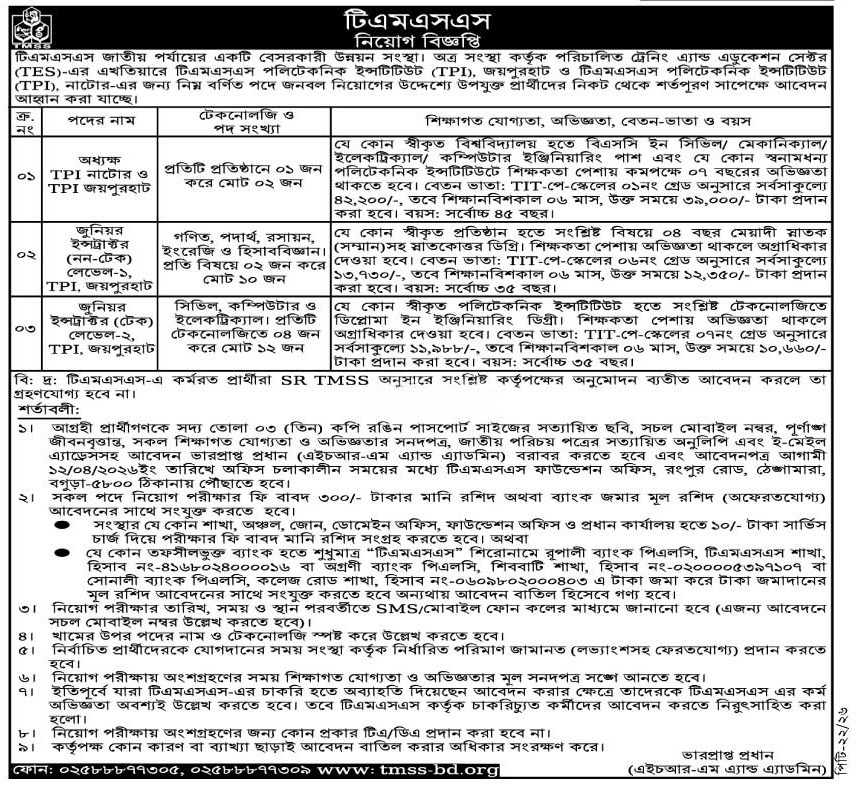 TMSS invites applications from suitably qualified, competent, and experienced candidates for recruitment to the following position(s) at TMSS Polytechnic Institutes (TPI) located in Joypurhat and Natore, operating under the Training & Education Sector (TES) of TMSS, subject to fulfillment of the prescribed terms and conditions.